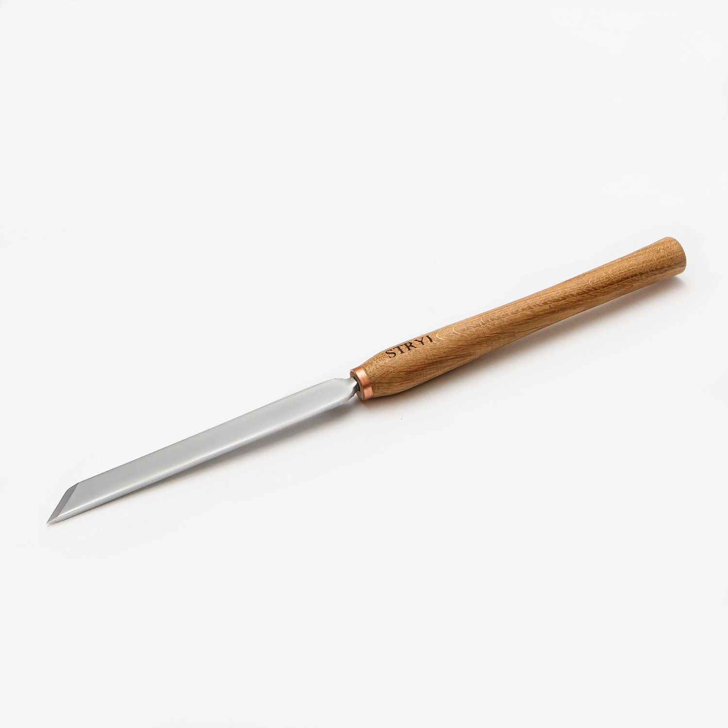 Wood turning cutting edge tool 20mm width and 45 degree skew. It's new, unused chisel. Metal thickness is 5mm. Rounded form of the cutting edge with one side sharpening perfectly finish the surface after other tools cuttings.