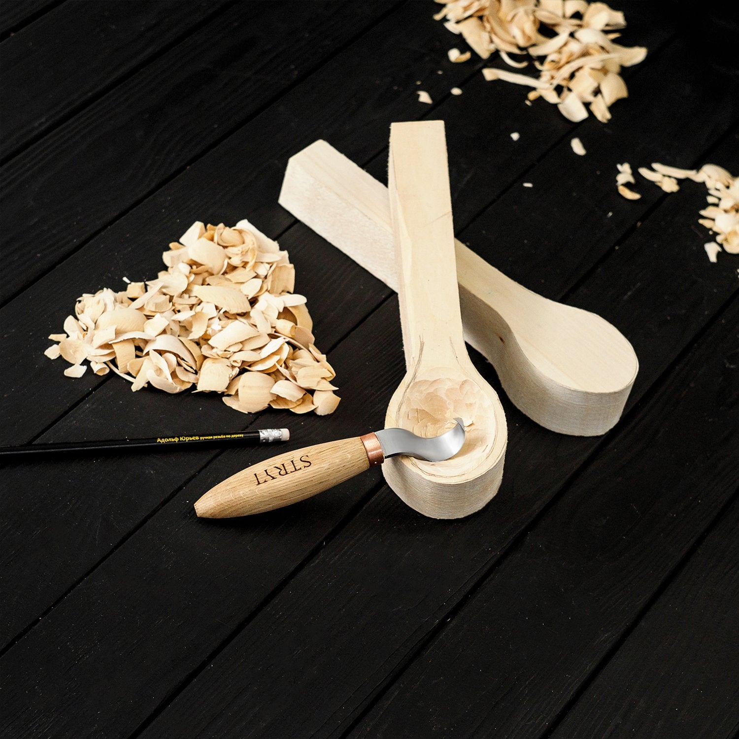 Using this tool you can cut out either soft or hard wood spoons of small and medium sizes. This rounded blade for a sampling spoon also can be used for carving bowls, concave surfaces in wood and other similar things.
